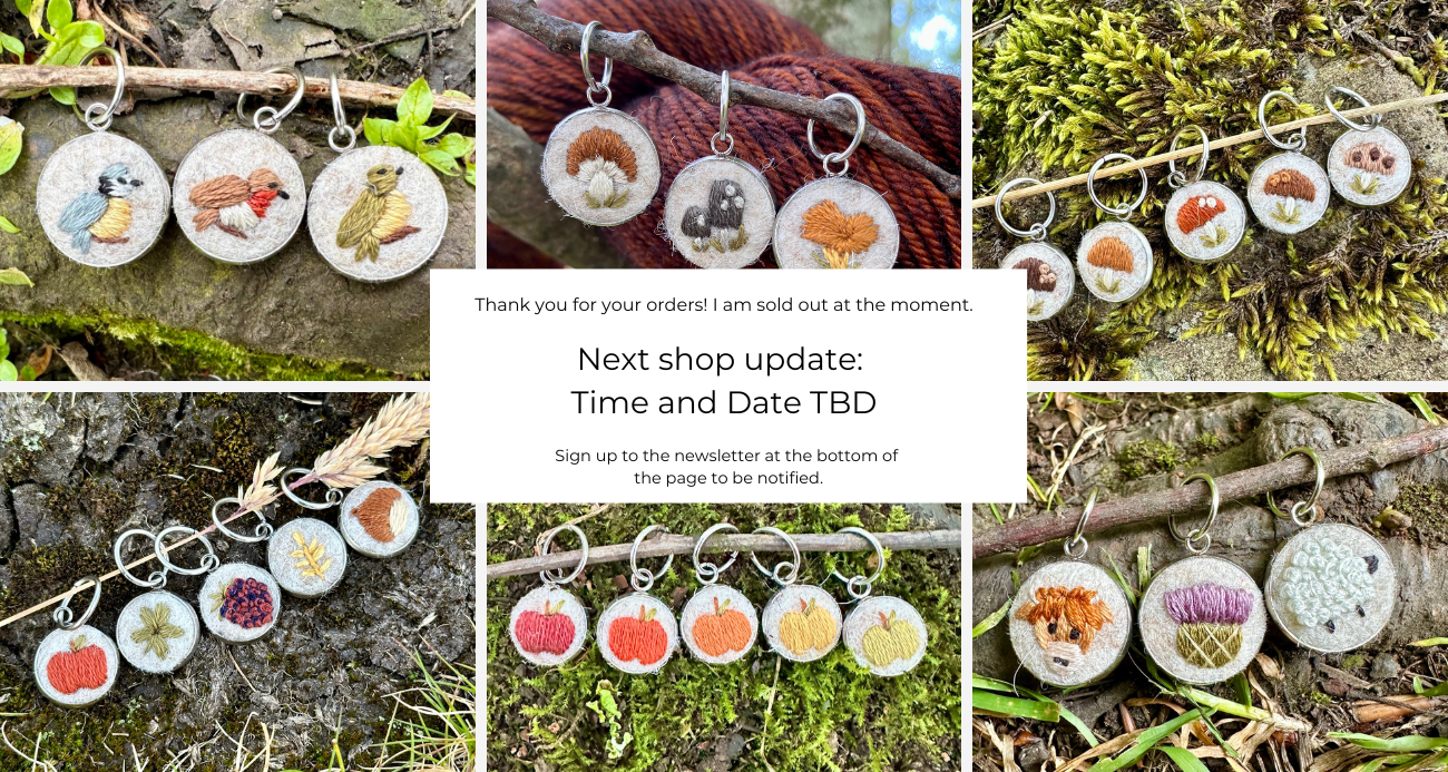 Inspired by nature, all stitch markers are embroidered and assembled by hand by me, Aude, in my small studio in Edinburgh, Scotland.