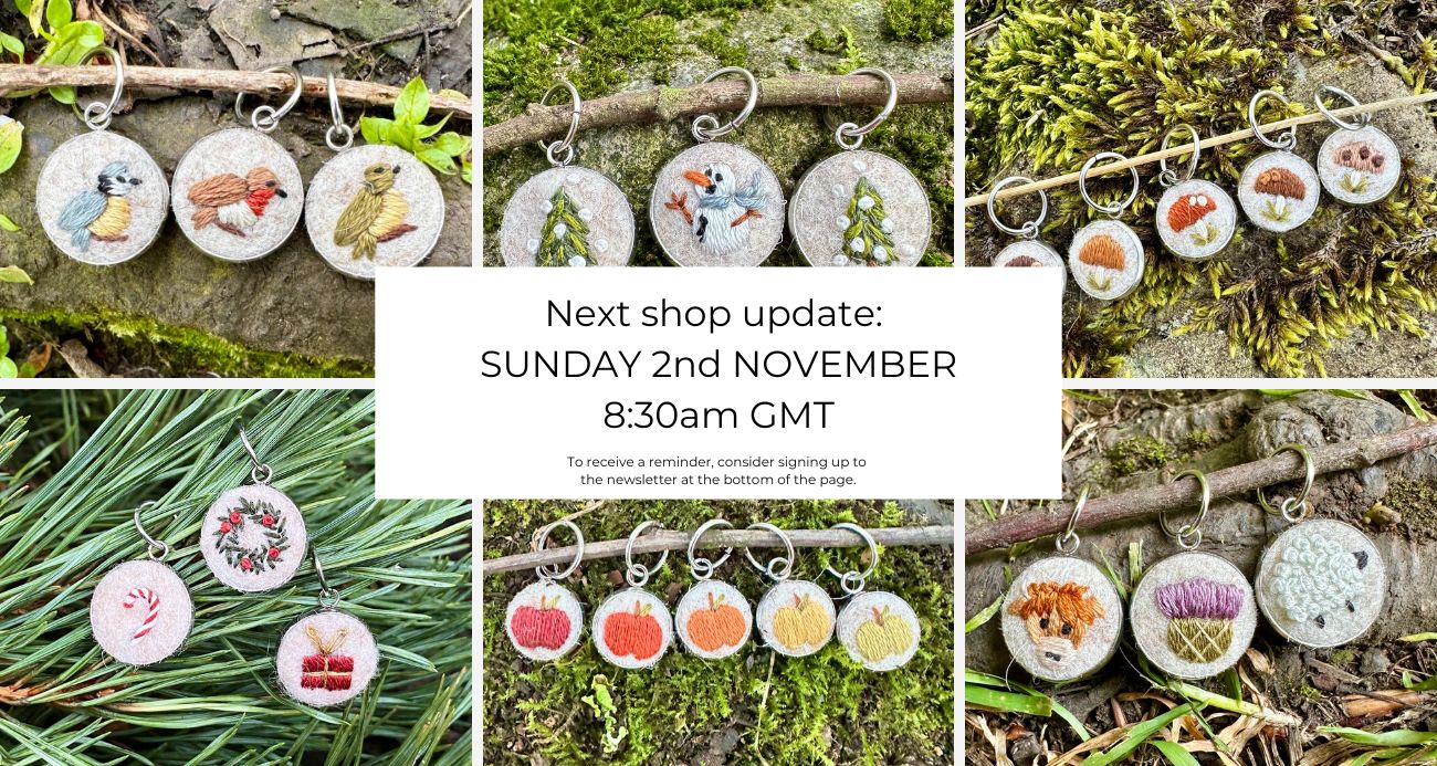 Inspired by nature, all stitch markers are embroidered and assembled by hand by me, Aude, in my small studio in Edinburgh, Scotland.