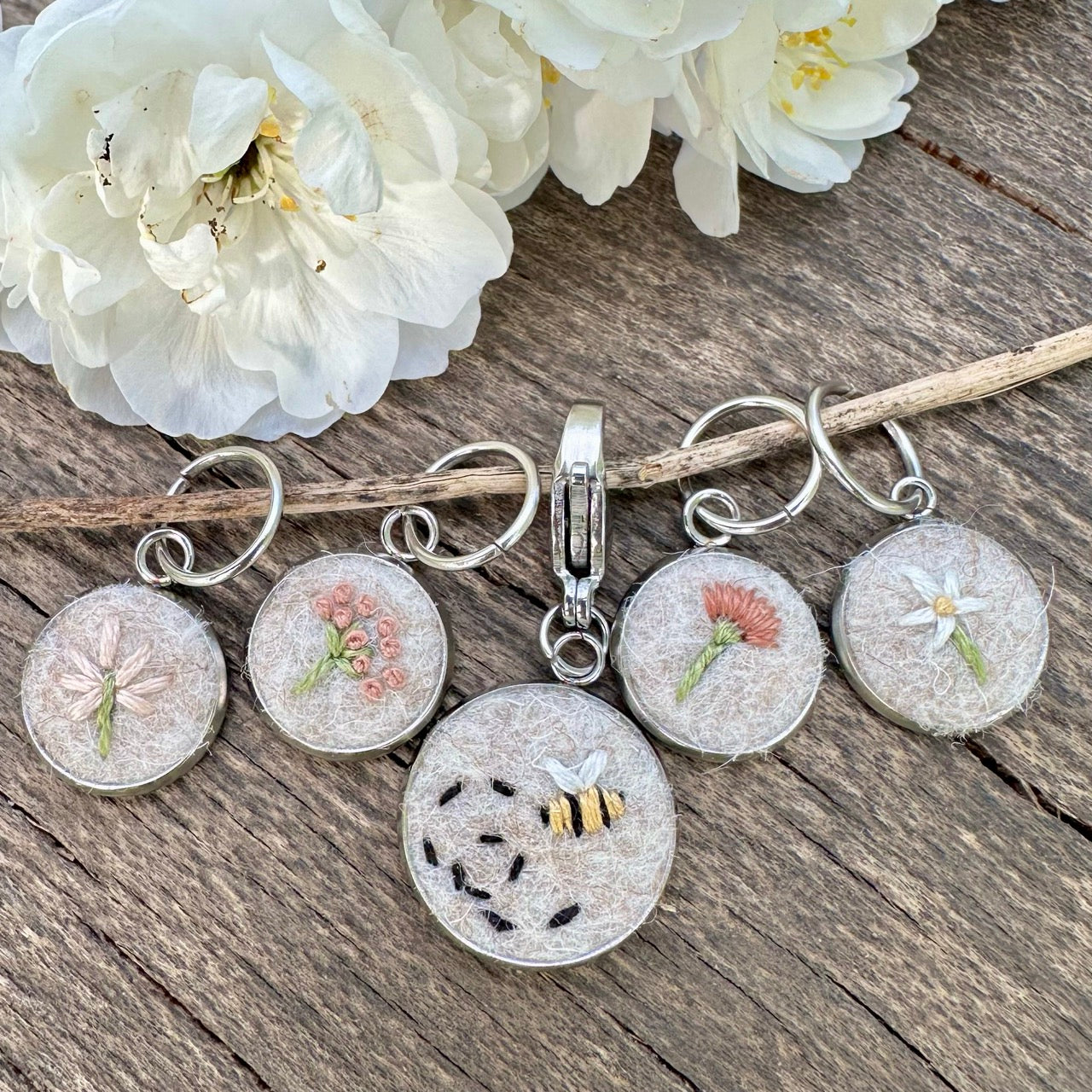 The stitch markers are embroidered with cotton embroidery thread on 100% British wool felt. The metal bits are stainless steel.