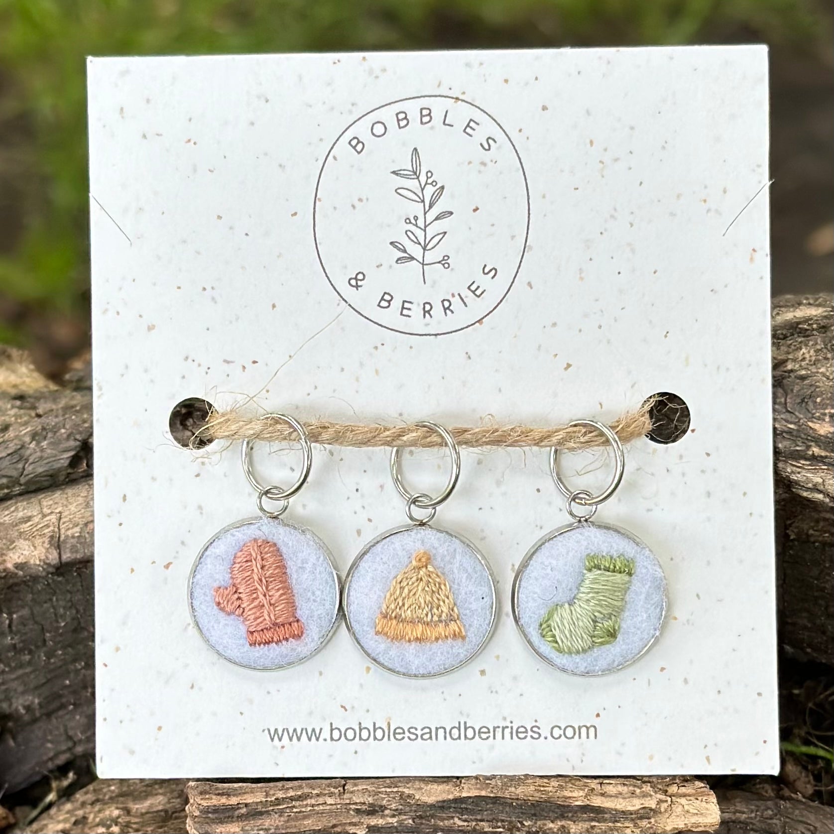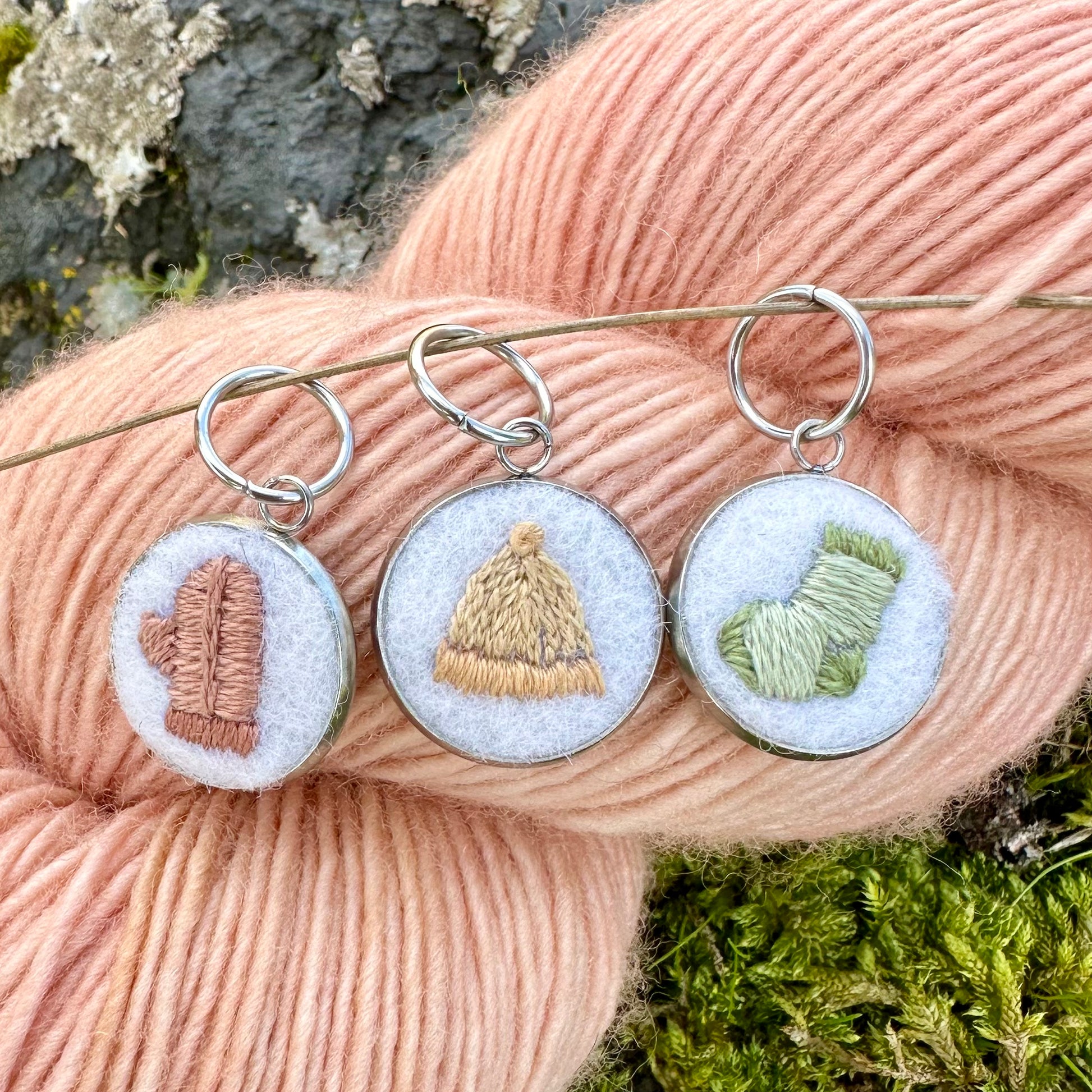 The stitch markers are embroidered with cotton embroidery thread on 100% British wool felt. The metal bits are stainless steel.