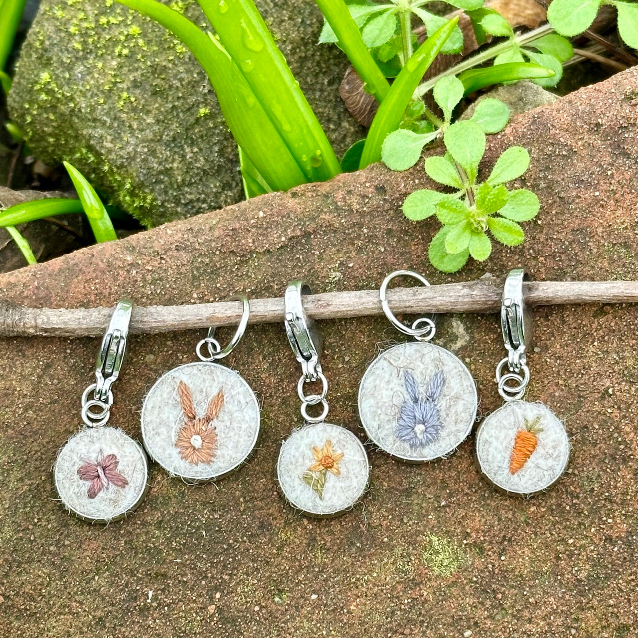 The stitch markers are embroidered with cotton embroidery thread on 100% British wool felt. The metal bits are stainless steel.
