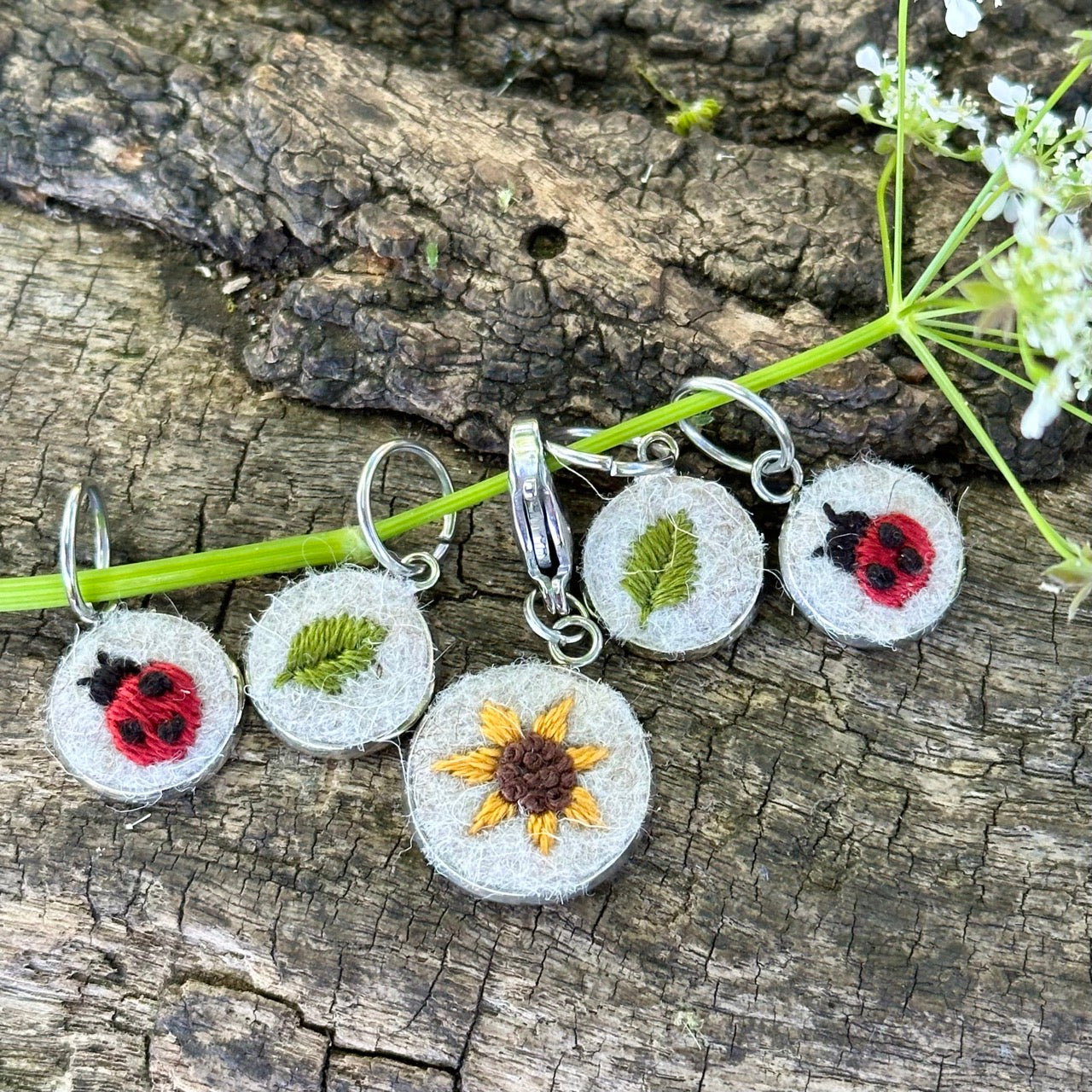 The stitch markers are embroidered with cotton embroidery thread on 100% British wool felt. The metal bits are stainless steel.